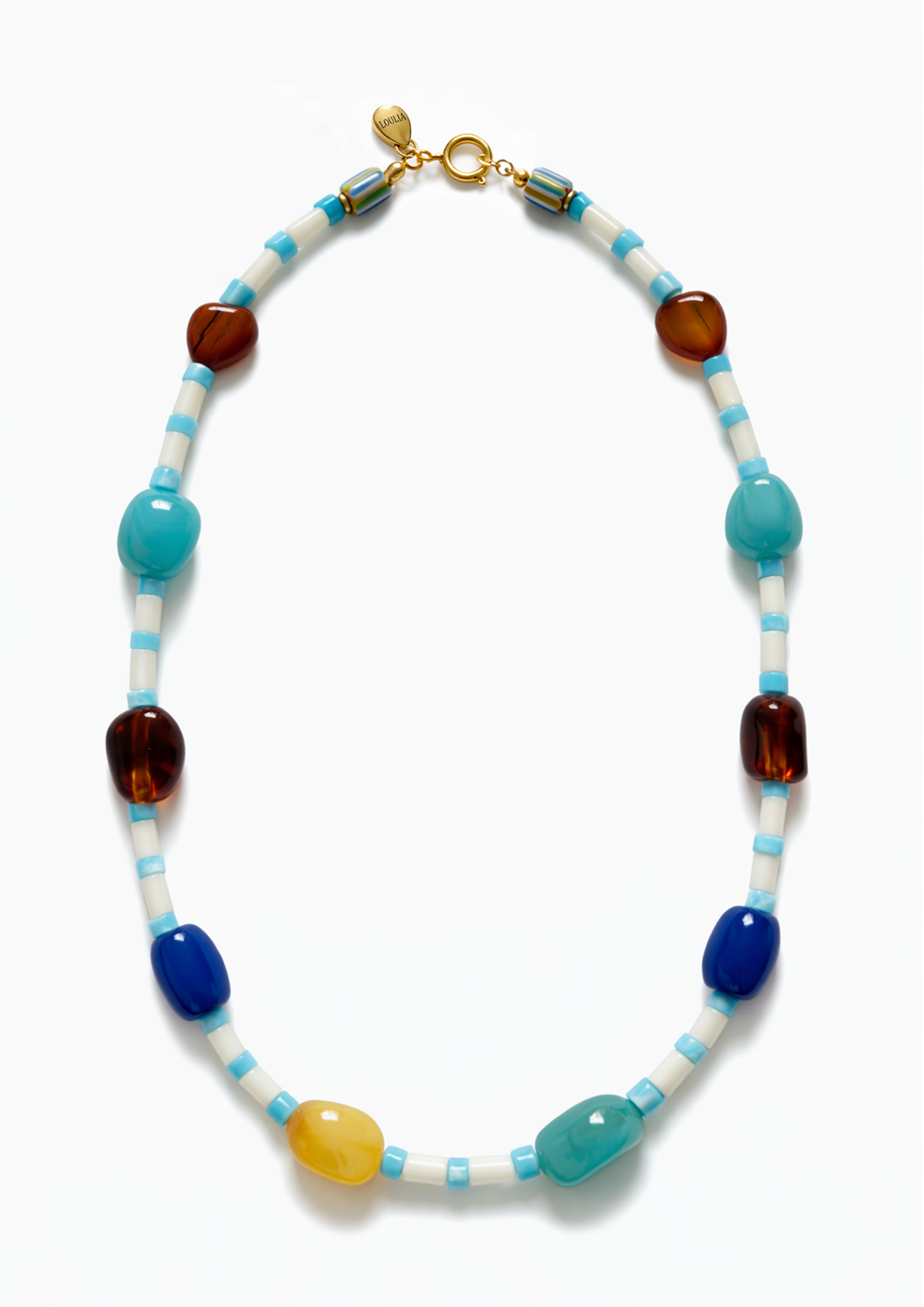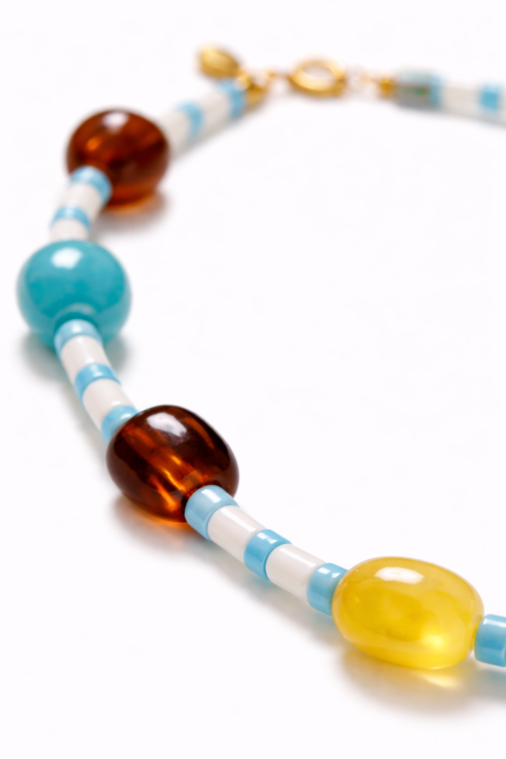 El yapımı renkli boncuk kolye. Turkuaz, amber, sarı ve lacivert cam boncukların beyaz ve turkuaz doğal taş küçük boncuklarla bir araya geldiği bu kolye, her kombine renk ve canlılık katıyor. Altın rengi yay kilit ile tamamlanan tasarım hem şık hem de kullanışlı.