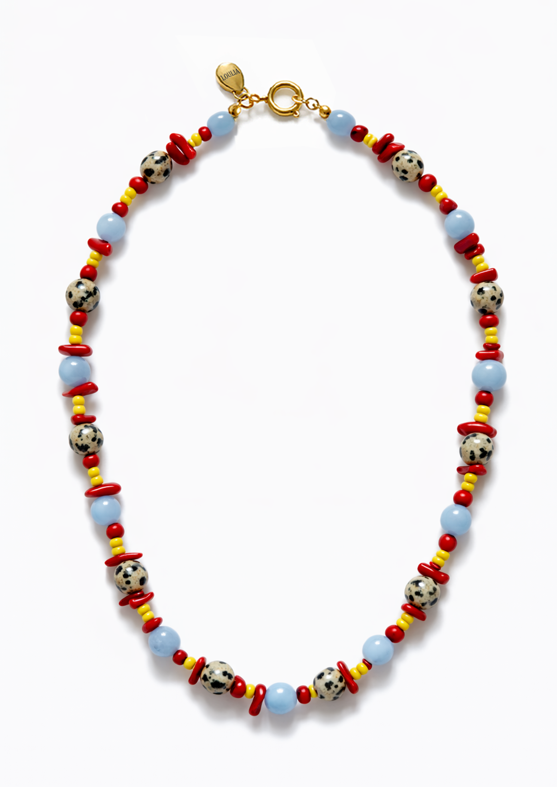 Bıldır, dalmaçyalı taş boncukların siyah benekli dokusuyla kırmızı mercan parçaları, bebe mavisi akvamarin ve sarı cam boncukların bir araya geldiği canlı ve özgün bir kolye. Her boncuk bir hikaye anlatıyor; bu kolye takıldığında geçmişin enerjisini bugüne taşıyor.
