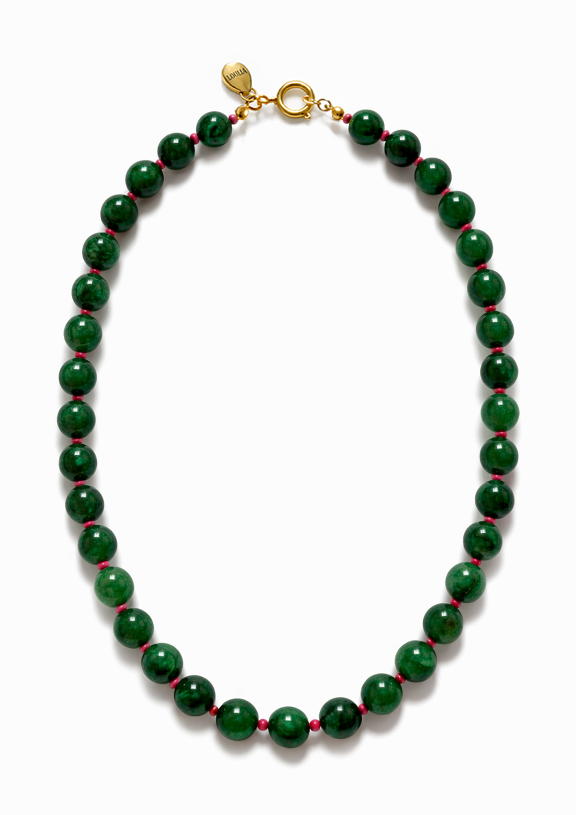 Greno, koyu zümrüt yeşili iri doğal taş boncukların arasına serpiştirilen fuşya küçük boncuklarla hayat bulan, göz alıcı ve cesur bir kolye. Yeşilin derinliği ile fuşyanın canlılığı bir arada; hem doğal hem de modern bir şıklık sunuyor. Takıldığında ormanın enerjisini taşıyan bir aksesuar.