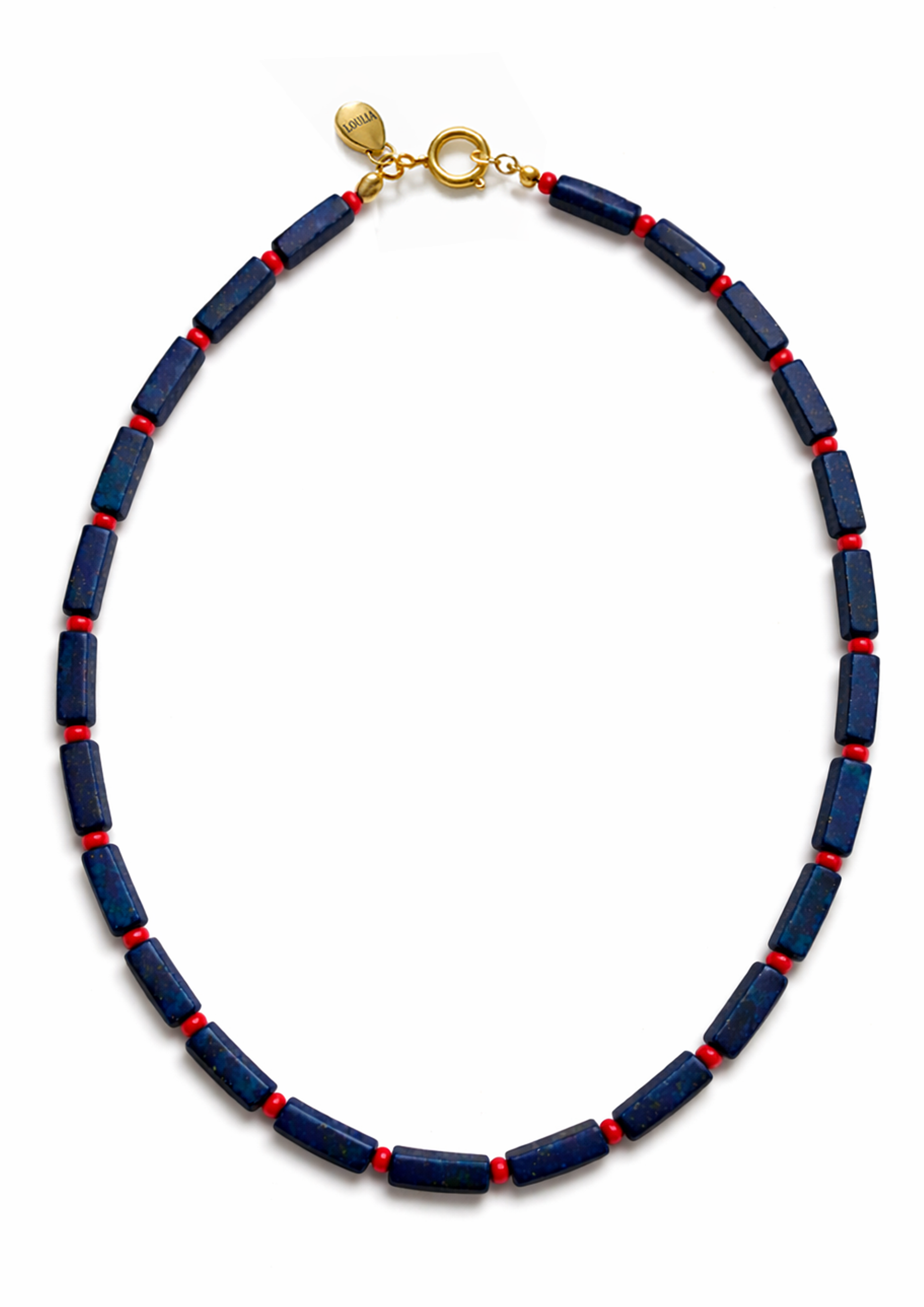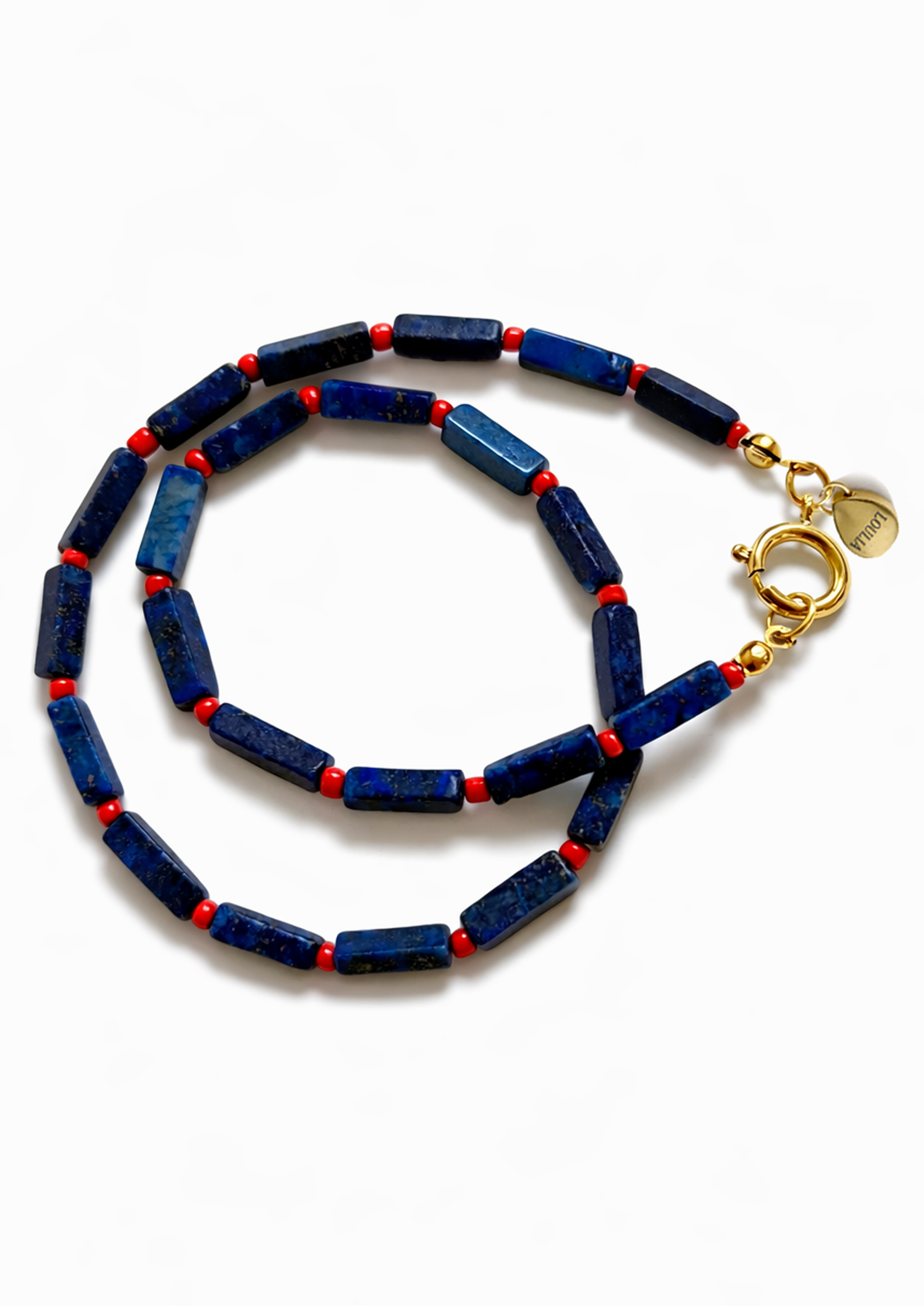 Lapis., derin lacivert lapis lazuli doğal taşın silindir boncuklar halinde işlenip kırmızı küçük cam boncuklarla ritimli bir düzende bir araya geldiği güçlü ve şık bir kolye. Lapis lazulinin kadim enerjisi ve kırmızının canlılığı bir arada; her kombine derinlik ve karakter katıyor.